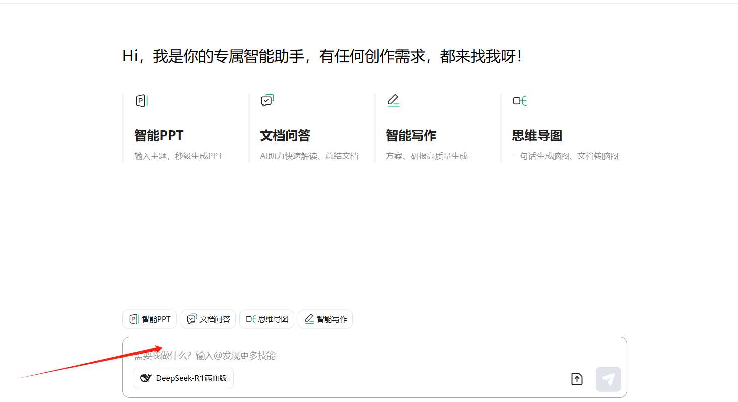 2)在对话框中输入指令,体验AI一键生成PPT、思维导图、行业研报、智能写作、文档问答AI满足任何创作需求。