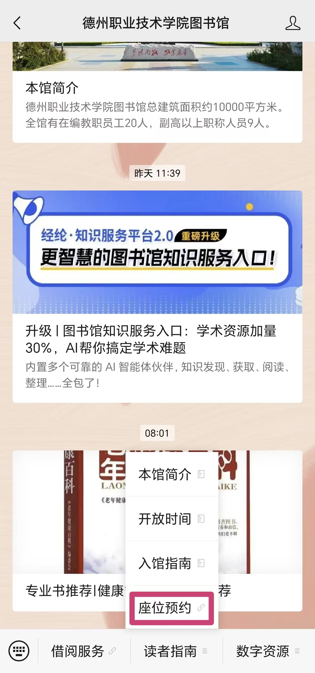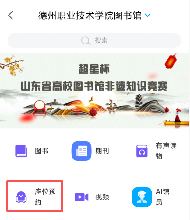 2.关注“德州职业技术学院图书馆”微信公众号,进入下方菜单“读者指南—座位预约”,通过手机号验证码的方式登录后,点击右上角的“邀请码”按钮,输入邀请码“dzzyjsxytsg”。
