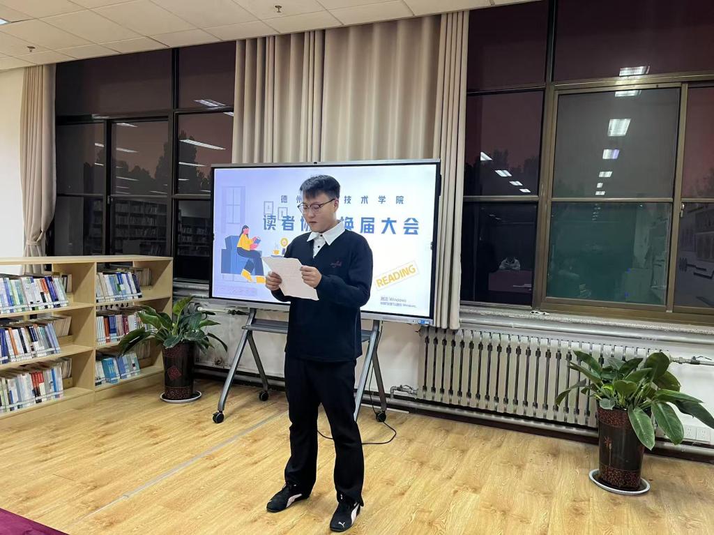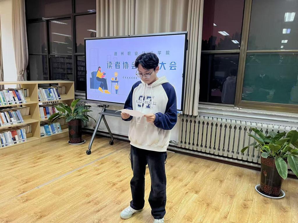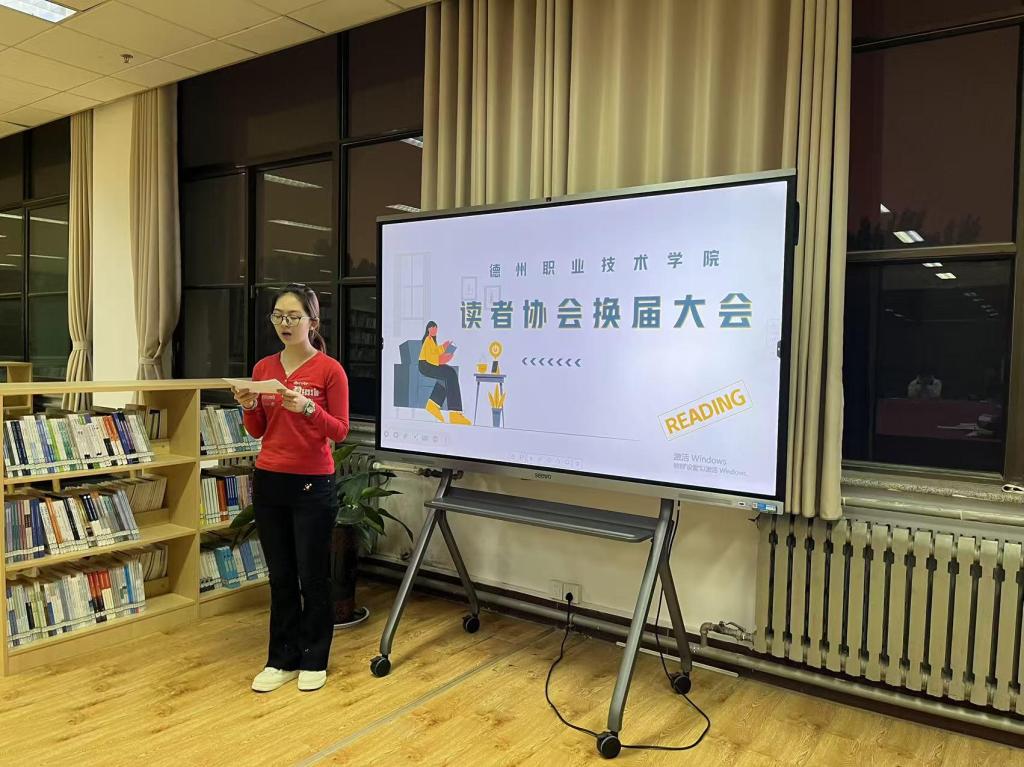 德州职业技术学院读者协会换届大会于10月30日19:20在图书馆三楼数字素养阅览自习室如期举行。读者协会指导老师陈微、王珊珊,会长单枭、副会长和来自各学院的17名竞选的同学参加了这次大会,活动持续一个半小时左右。